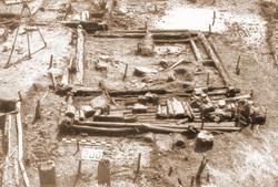 На фото: Деревянные конструкции 1 половины XIII в. (раскоп 10 на ул. Ленина, 1988 г.)