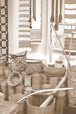 Санки на деревянных полозьях, коромысло, багор, косарь, топор для щепы, тесло для долблёнки, устрашающих размеров нож для рубки мяса, футляр для оселка, мотовило, различных конструкций маслобойки, странные лопаты, предназначенные для выкапывания торфа…
