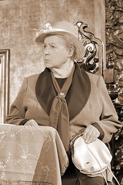 С поднятием занавеса захотелось сразу поаплодировать «декоративным» средствам. Художник-постановщик спектакля Валерий Мелещенков со своей задачей справился отлично (надо заметить – в очередной раз). Действие не выходит за пределы одной комнаты, которую художник оформил так, что жить в ней нельзя. Ее можно только показывать гостям (да и не всякого гостя пригласят в такую гостиную), а потом зачехлять мебель, тушить свет и закрывать на ключ. Золото, вернее, позолота, роскошная обивка кресел, рамы без картин, оправы без зеркал, в общем: «обстановка красного дерева». «И часы здесь тоже мебель», - кряхтит старик Чмутин (Засл. артист Виктор Яковлев), абсолютно инородное тело в этом блестящем царстве.