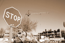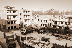 | Строящееся здание, замыкая квартал, изменяет масштаб сложившейся исторической среды, морально уничтожает историко- культурный ландшафт правобережья. Фото: Лев Шлосберг |