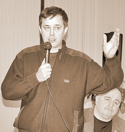 Единственным представителем администрации города, взявшим микрофон, и то по активному настоянию ведущего, был главный архитектор города, заместитель начальника городского управления строительства и архитектуры Сергей Славинский. Подтвердив очень тихим голосом справедливость «всего сказанного предыдущими ораторами», главный архитектор сообщил несколько важных вещей: новый генеральный план города, финансирование разработки которого практически не ведется (немой кивок в сторону главы города), будет в ближайшее время вынесен на публичные слушания; главной экологической проблемой города является не мусор на всех улицах и даже не «вросшая» в город свалка, а нахождение в городской черте, на землях, пригодных для жилой застройки, аэропорта, что делает Псков злостным нарушителем всех мыслимых норм по уровню шума; аукционное выделение участков земли под жилищное строительство на территории города на самом деле делает получение этой земли невозможным даже для лиц среднего достатка (в качестве примера главный архитектор привел себя, отметив, что не смог бы заплатить 700 тысяч рублей за участок земли в городской черте, немой кивок в сторону администрации области, принявшей соответствующий закон); а с точечной застройкой («Это воровство и коррупция!!!» - Игорь Савицкий) уже практически покончено («Все участки розданы», - вполголоса прокомментировали некоторые участники).