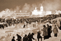 Место проведения псковской «Всероссийской масленицы» – «прикормленное». На городском пляже долгое время проходило главное псковское представление – форсирование реки Великой на День Города. Несколько лет назад форсирование отменили – из-за сотрясения, которое разрушало древнейшие фрески Спасо-Преображенского храма Мирожского монастыря [ 4 ]. И вот теперь там же началось не менее шумное мероприятие – с фейерверками и тому подобным. Разве это не чудо?